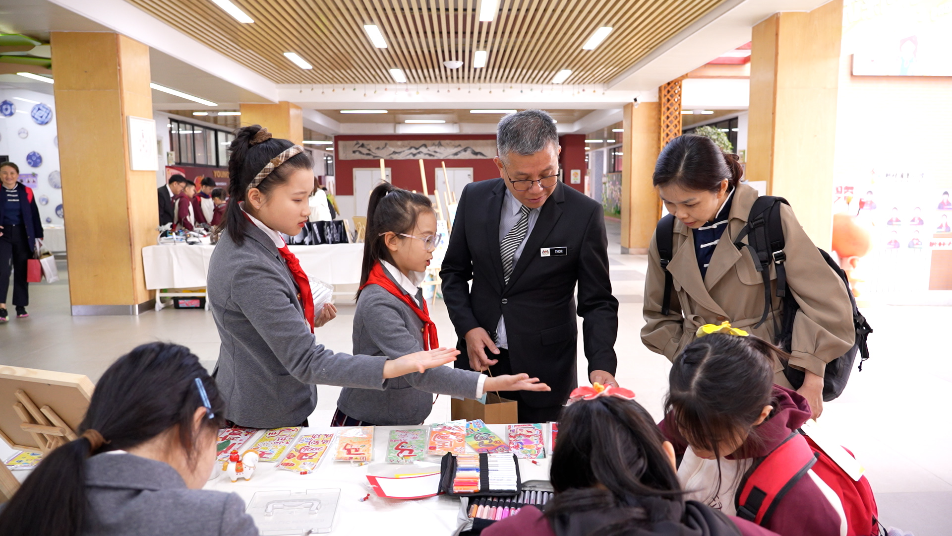 在中华优秀传统文化扎染课体验区,新村国奥小学学生向代表团成员讲解扎染技巧,代表团成员在折、扎、染的亲手实践中,感受中华传统工艺的独特魅力;在羽毛球友谊互动环节,中马师生以球会友、切磋技艺,在运动中增进了解、加深情谊。文艺展演现场同样精彩纷呈:新村国奥学生带来的《春分》节气舞蹈,灵动展现中华时节之美;以英文演绎的《后羿射日》神话故事,创新传递东方文化魅力;马来西亚学生则以动感十足的舞蹈展现热带风情。